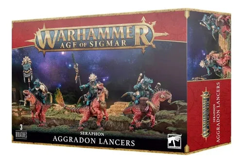 Este kit de plástico multicomponente construye tres Aggradon Lancers: una formidable y sanguinaria caballería Seraphon. Todos los saurus riders pueden estar armados con un garrote de celestita con púas o una lanza de celestita perforante, y cada uno viene con dos collares blindados para que elijas las poses. Se puede construir un modelo como campeón alfa, con una selección de cabezas y armas únicas, poses de brazos alternativas y un escudo único, uno como músico de tambor de guerra y otro como un imponente Icon Bearer.